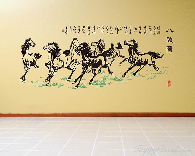 This wall decal is about 8 horses galloping on the grass with some Chinese characters.