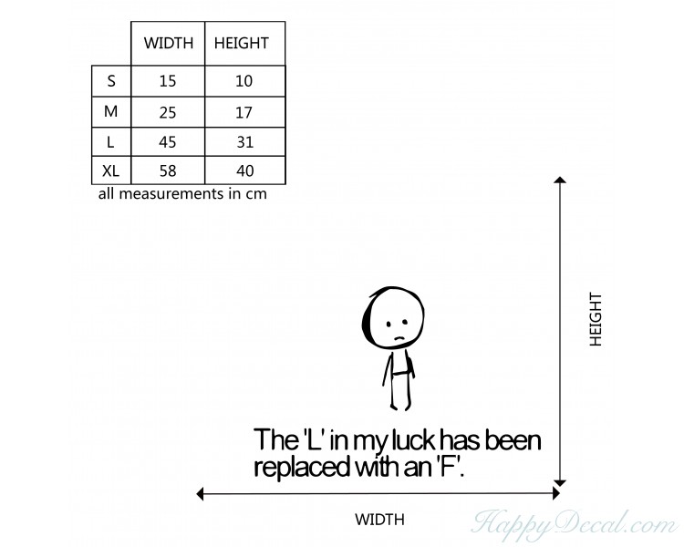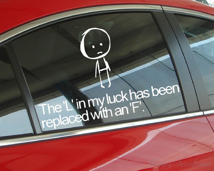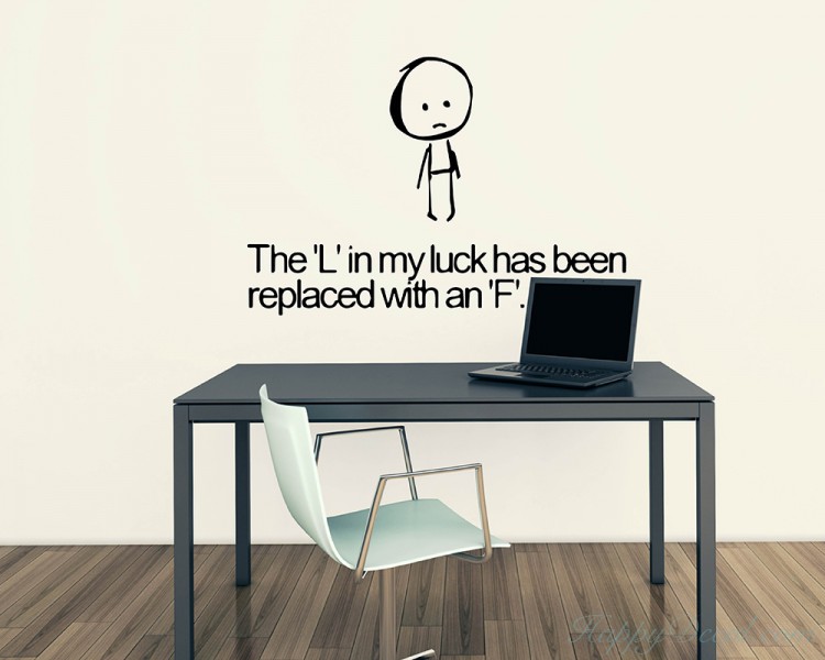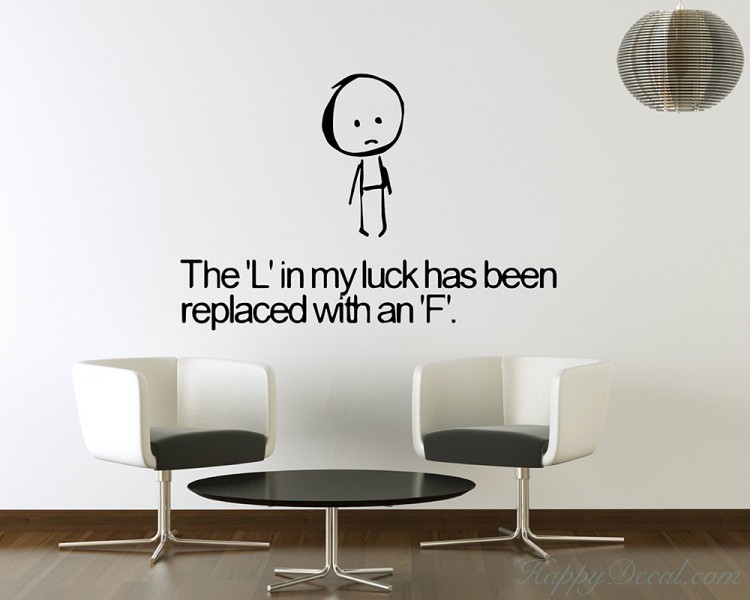 This wall decal is about 1 cute figures with the say: The 'L' in my luck has been replaced with an 'F'.