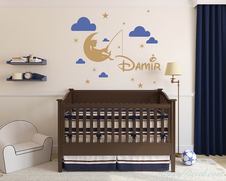 Boy fishing on the moon with your little one's name in Walter font, a perfect touch for a nursery or a kids room. It provides your walls the look of a custom paint job that is absolutely stunning.