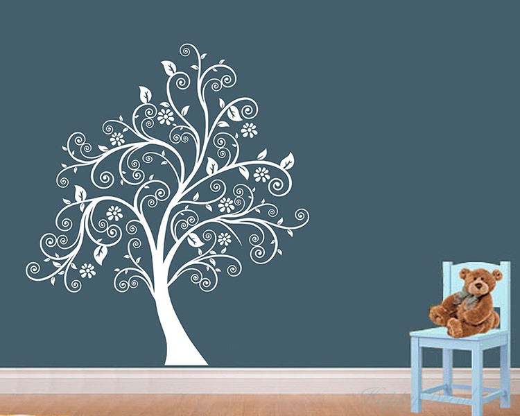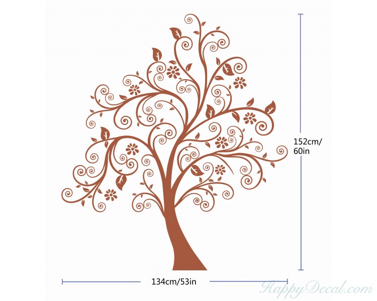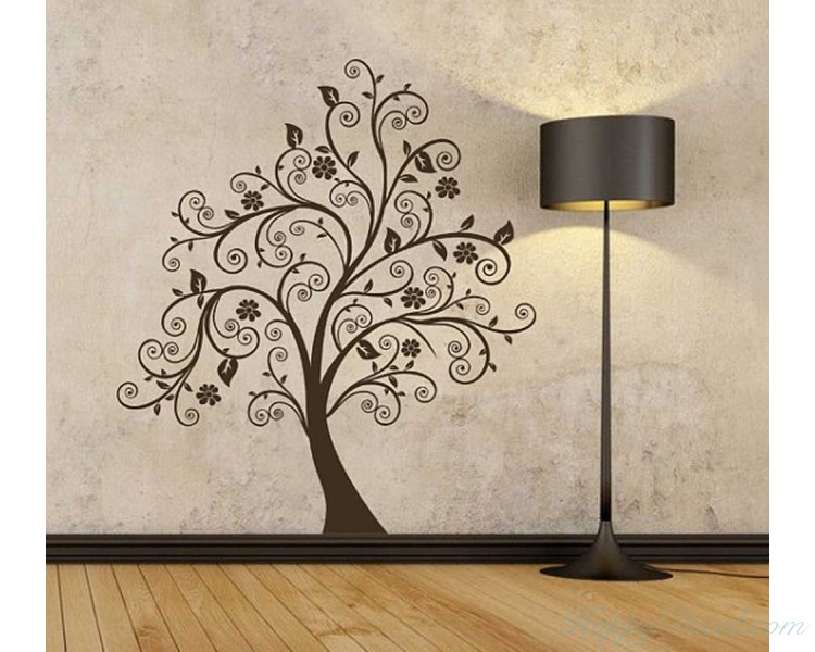 This is a large scroll tree wall decal with some leaves and flowers.